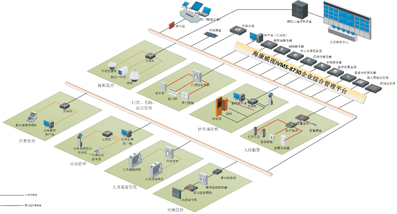 企业综合安防解决方案整套系统由前端设备、传输网络、监控中心构成,前端涵盖了视频监控、停车场管理、入侵报警、门禁一卡通等多个子系统。对于企业综合管理系统的建设,不是对各个子系统进行简单堆砌,而是在满足各子系统功能的基础上,寻求内部各子系统之间、与外部其它智能化系统之间的完美结合。系统主要依托于企业综合管理平台,来实现对众多安防子系统的统一管理和控制,通过企业综合管理平台建设,实现统一数据库、统一管理界面、统一授权、统一权限卡、统一安防管理业务流程等,同时考虑将各安防系统资源作为信息化基础数据,满足部分生产运营管理的业务需求,辅助业务流程优化。